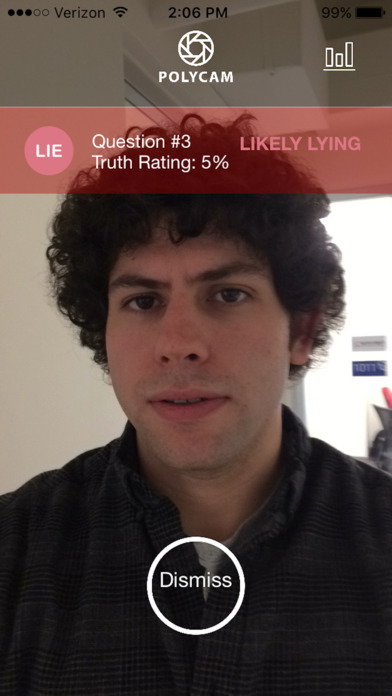 PolyCam is a lie detector app. Ask your subject a question and snap a picture of them as they’re answering to see how likely it is that they’re lying.